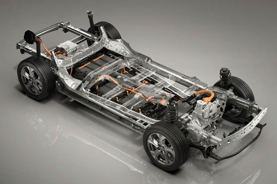 但是看到MX-30的底盘架构图,才知道事情的真相并没有那么的简单,MX-30车头发动机舱的位置留出了较大的空位,明显是为安装内燃机做准备,而且座舱的电池位置也并没有最大化,更像是为燃油车的四驱传动轴留出空间。