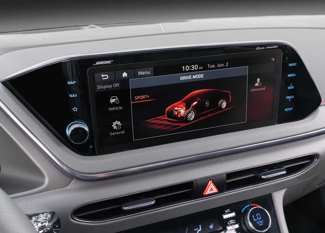 除此之外,索纳塔N Line最大的亮点就是提供了多种驾驶模式可选,其中新增的运动+模式会对车辆动力响应和转向手感进行极致的运动化,让驾驶体验进一步提升。10.25英寸的中控大屏配备了Apple Carplay手机互联功能,搭配BOSE提供的扬声器,足以带来移动音乐厅般的体验。