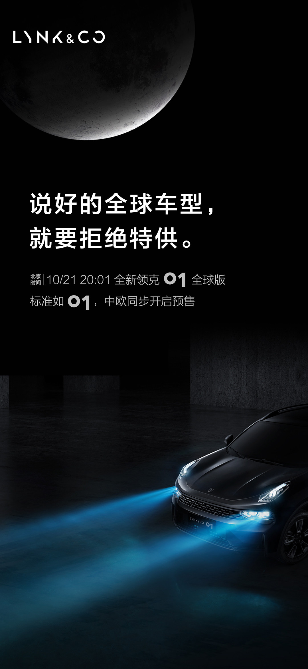 不久前,领克发布全球版车型的最新预告图,并且宣称“说好的全球车型,就要拒绝特供。”而且随之公布的还有预售时间,定于北京时间10月21日晚上20:01,中欧同步开启预售。