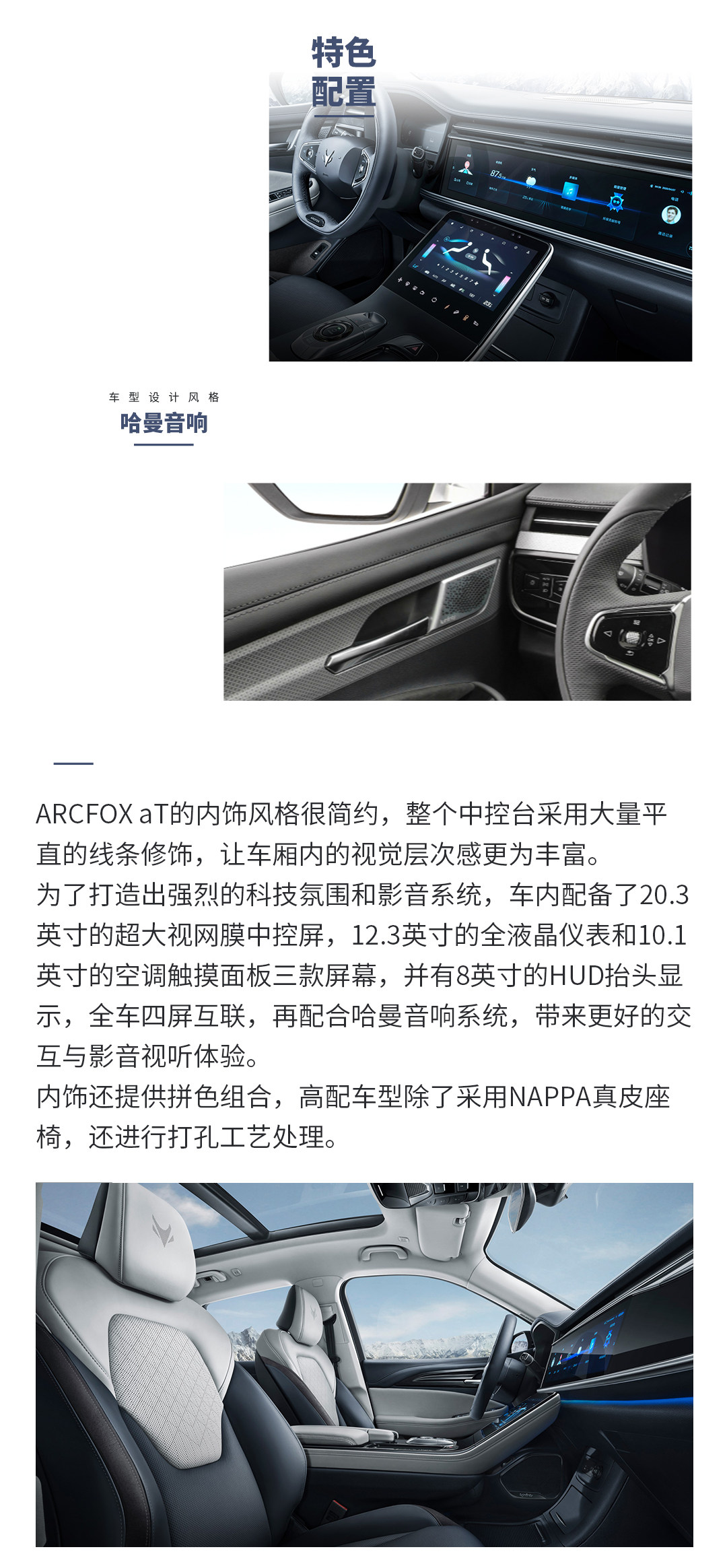 ARCFOX aT基于蓝谷·麦格纳IMC架构平台打造而来,IMC架构平台专为纯电动车进行开发,能够满足超级拓展、超级智能、超级交互和超级进化四大特征。动力总成采用三合一高度集成化设计,整个动力总成由法雷奥西门子和博格华纳联合打造。