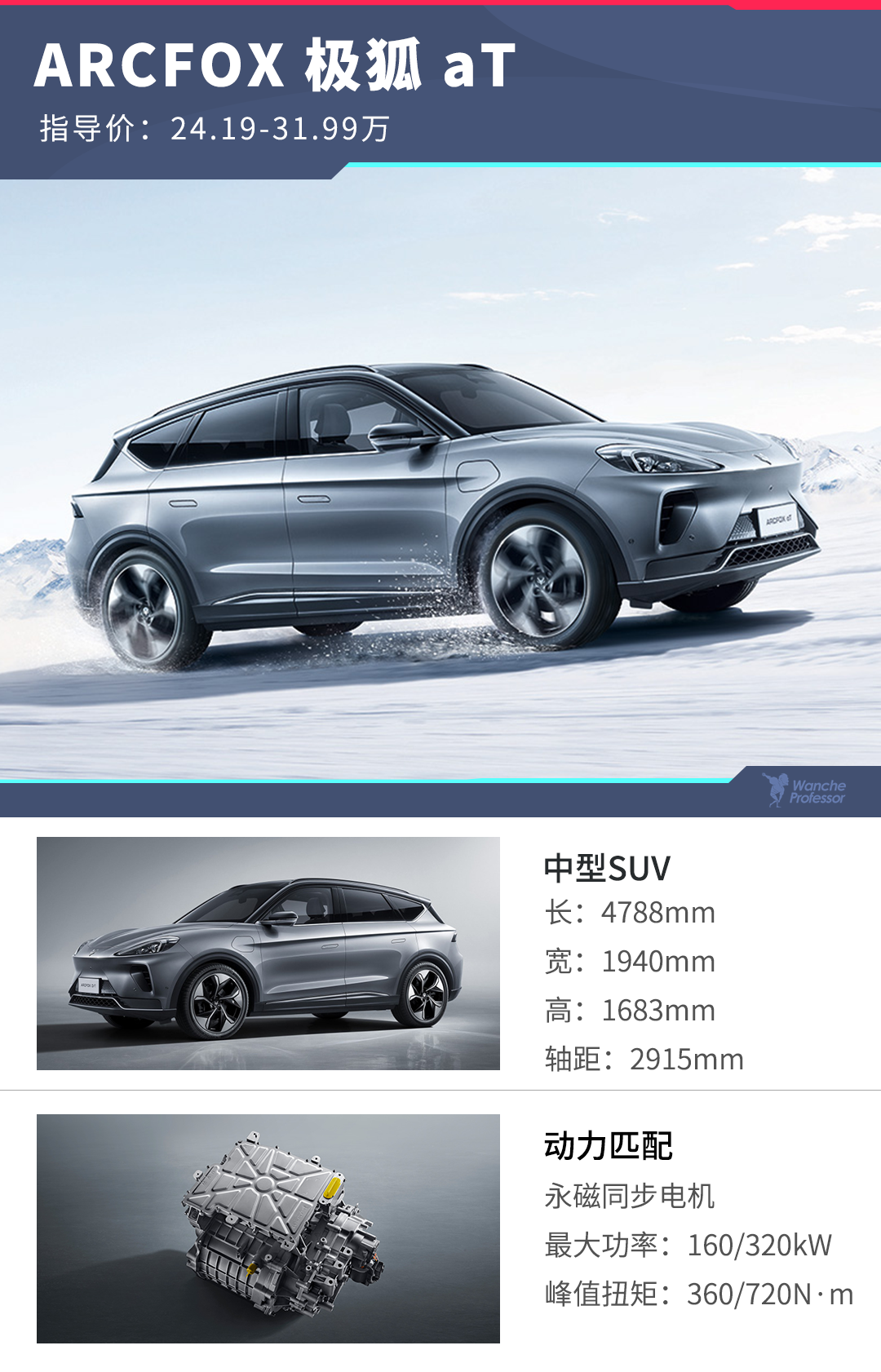 ARCFOX aT推出了单电机和双电机两个动力版本,160kW的前置单电机最大扭矩360N·m,双电机前后最大功率都为160kW,综合总功率320kW,综合总扭矩为720km。双电机版零百加速时间仅为4.6s,顶配还配备自适应全地形四驱系统,底盘由北欧麦格纳团队调校,在操控和舒适性之间有更好的平衡。