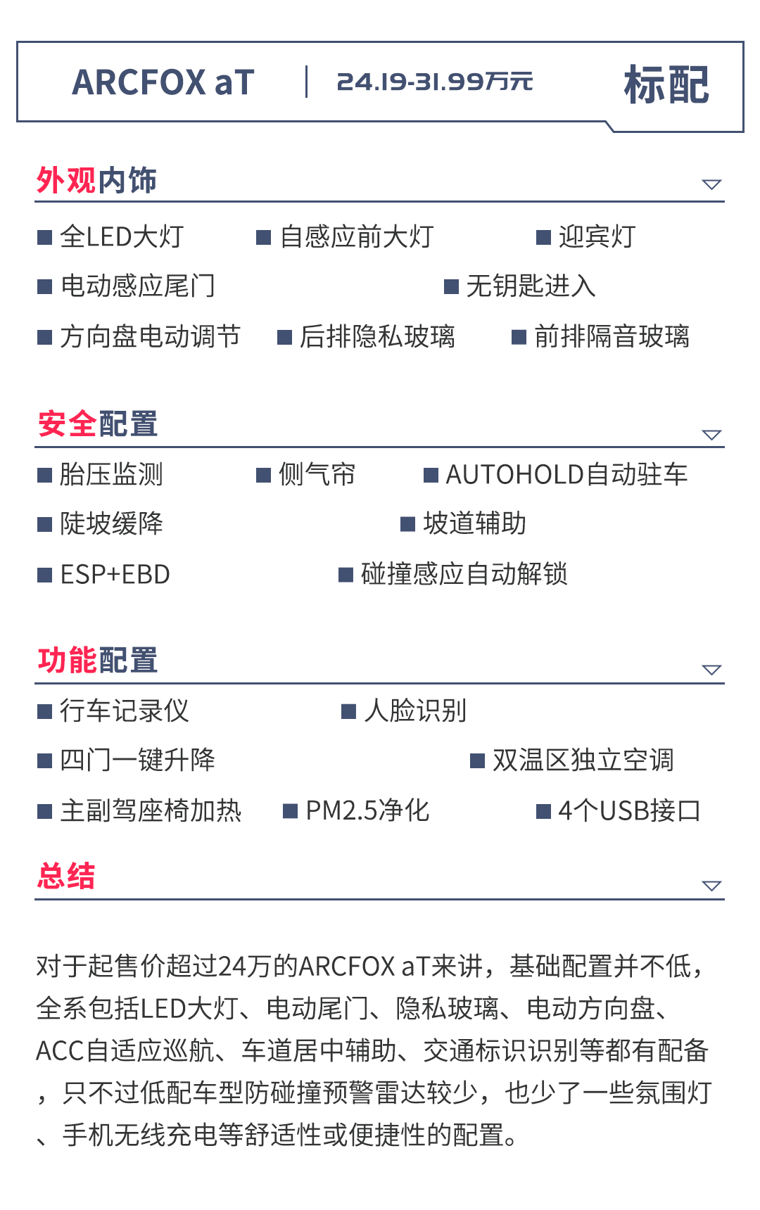 但麦格纳拥有经验丰富的造车技术沉淀,有着一套高标准和成熟的制造体系,北汽蓝谷麦格纳制造基地更是麦格纳欧洲之外的第一个整车制造基地。所以,拥有麦格纳制造背景的ARCFOX aT无疑在造车工艺和品质追求上的标准不低,这或许是ARCFOX aT的底牌之一。