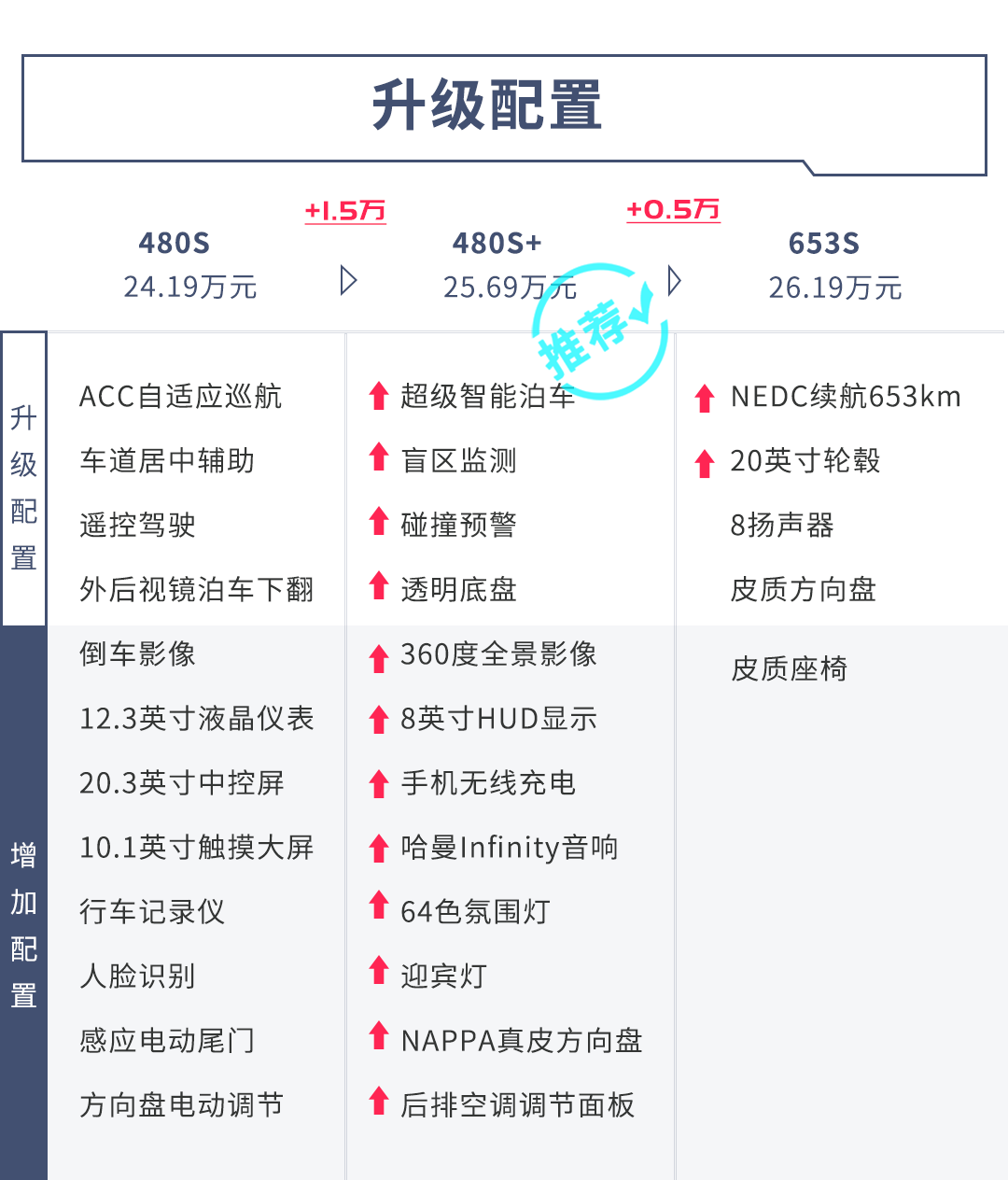 虽然续航653km的车型可以进一步降低里程焦虑的问题,但是本身车价已经达到26万以上,且650S版很多配置都有所缺失,包括更高级的自动辅助驾驶功能等,所以480S+相对而言更值得推荐。