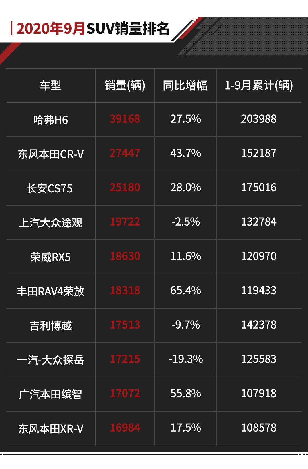 具体来看,9月份轿车销量92.9万辆,同比增长8.2%;而在SUV这块的话,9月份SUV销量87.6万辆,同比增长8.5%。那么在SUV这块持续火爆的细分领域中,有哪些车型昂首阔步,又有哪些车型黯然退场呢?