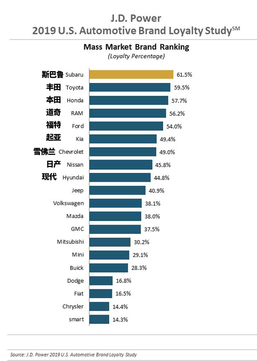 斯巴鲁这个品牌在国内绝对是一个小众到不能再小众的日系品牌,但根据J.D.Power在2019年对美国市场的调查,斯巴鲁品牌以61.5%的消费者忠诚度位居汽车品牌忠诚度榜单第一名,也就是说美国有一半的斯巴鲁车主,会在后续车型上继续考虑斯巴鲁这个品牌。