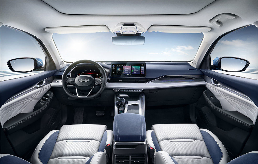 在内饰的颜色搭配上面,也是让买买君感到为之意外的,整体在中控台、座椅、门饰板、中央扶手箱等处均采用了游艇蓝和高级灰拼色,并且采用了大面积的皮质包裹,整体将车内的高级感提升了一个档次。