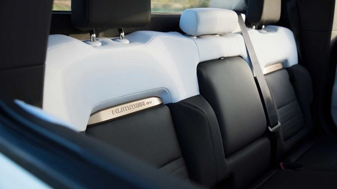 黑白双色搭配的皮质座椅质感细腻,而镶嵌在座椅上的悍马EV英文标识则彰显着豪华的身份。