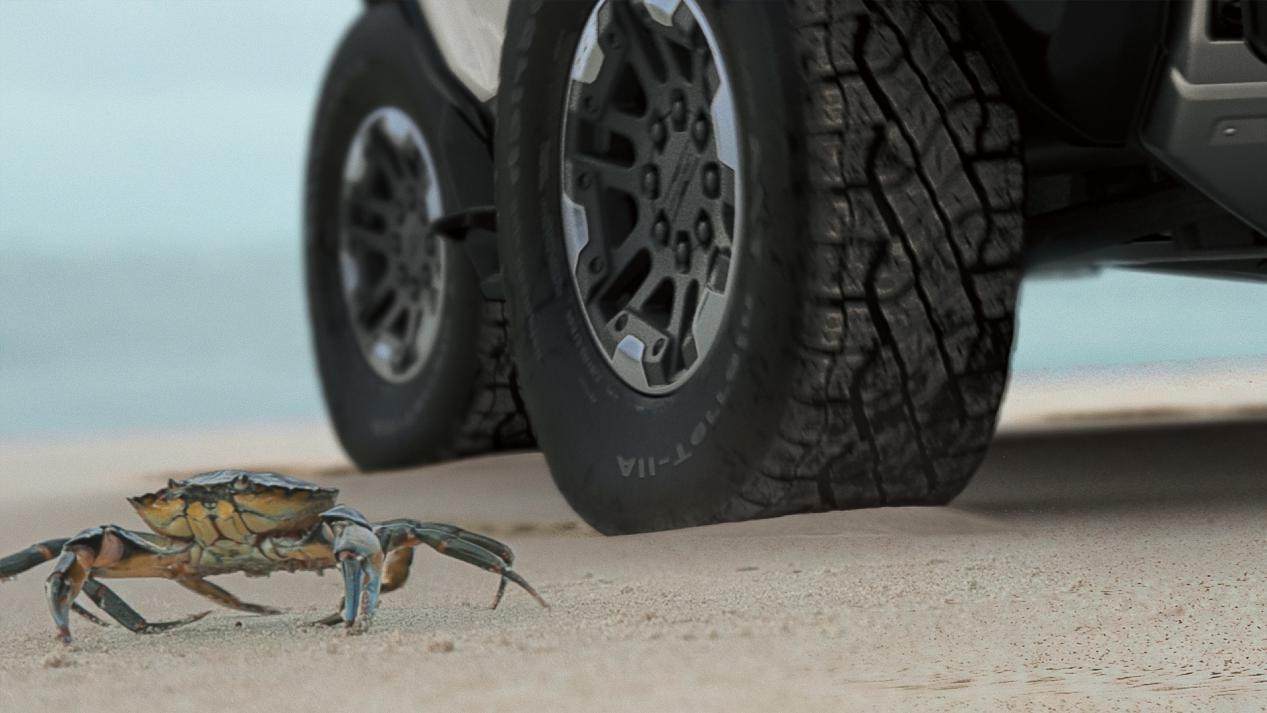 值得一提的是,悍马EV还带来“螃蟹模式”功能,有点类似长城炮的坦克掉头功能,其后轮可以随前轮一同向左或向右转动一定角度,从而有效减小转弯半径,使其具备了更强的道路通过性。