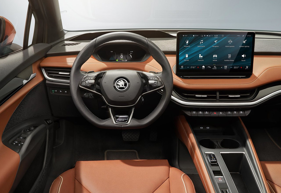 内饰方面,些次斯柯达ENYAQ iV的设计理念,主要是简洁家用风格,尤其值得一说的是方向盘下方的水晶状设计,档次感十足,而座椅材质则采用的是含40%羊毛成分的生态座椅,并且最高配车型上搭载9个安全气囊。