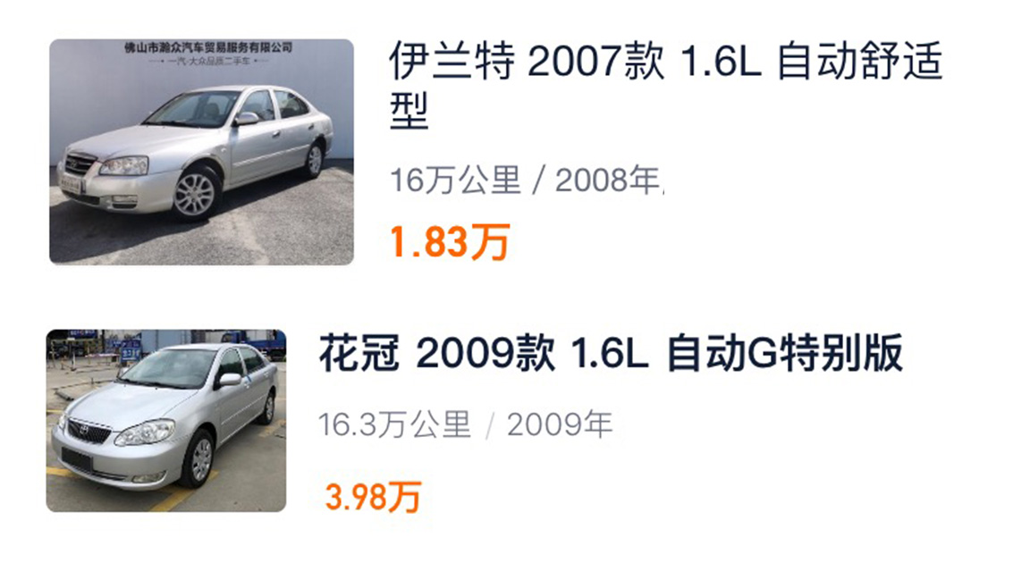 不过教授还发现它们都存在一个“通病”,就是严重折旧。参考了几个二手车平台,同年份并超过15万公里的伊兰特(当年1.6L车型起售价为8.98万元),二手价格普遍不到2万元,而2010年前后行驶了10万公里的花冠(当年1.6L车型起售价为9.28万元),二手价格也在3-4万元左右。虽然两款合资车的折旧率远不及二手奇瑞瑞虎只能卖5000元的夸张程度,但如此的低价也足以让车主进退两难——究竟还卖不卖好?