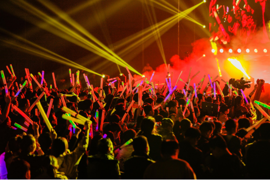 活动现场,精彩节目不断,俊男靓女,即刻开“嗨”。新流派Ipad留声机乐队及聚丙乐队先后十余首歌曲上演电音轰趴,台上电音流动,台下荧光闪烁,全场观众跟着节拍动感舞动,让重庆微凉的夜空瞬间热情高涨。而吉克隽逸三首成名曲联唱,更是将现场不断推向高潮,打造了一场真正的嗨玩儿盛宴。