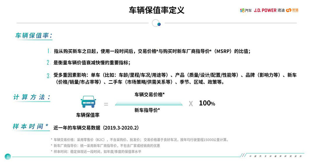 保值率是指某款车型在使用一段时期后,二手车的交易价格与先前购买价格的比值。保值率是车辆剩余价值的参考依据,同时也意味着转手后的资本回笼或说流失程度。虽然是单个数据,但是背后已经包含了品牌、汽车性能、保有量、可靠性、配件价格及维修便捷程度等多个因素,是一辆汽车综合水平的体现。