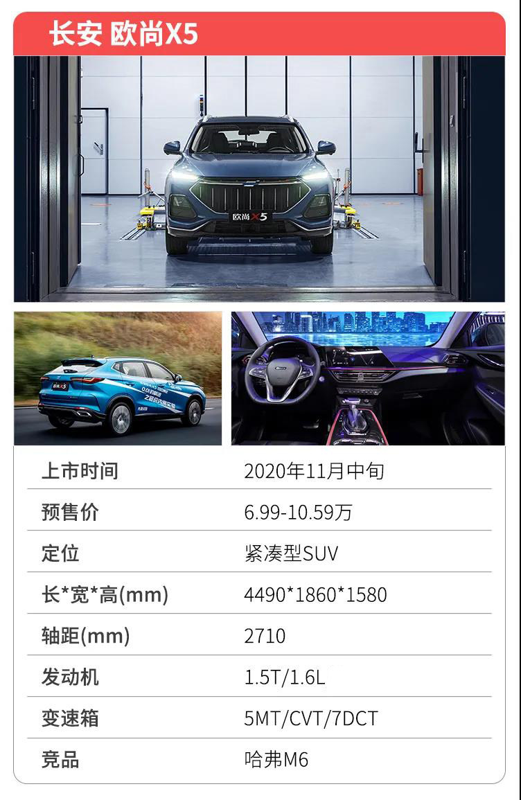 欧尚X5虽然听着命名数字低于欧尚X7,但定位并不低后者,一样是紧凑型SUV,不同的是欧尚X5更偏向于年轻市场,可以说是长安欧尚版的“Uni-T”。相同的大进气格栅,相似的分体式大灯,还有神似的溜背式线条,整体而言颜值相当高,起码在6-10万级别无敌手。尺寸方面也优于同价位的小型SUV,达到了4490*1860*1580mm,轴距则是2710mm。动力方面,除了BlueCore系列的1.6L发动机,还有最新的蓝鲸系列1.5T发动机,匹配7速双离合变速箱。6.99-10.59万的售价之下,这款亲民SUV难以不火。