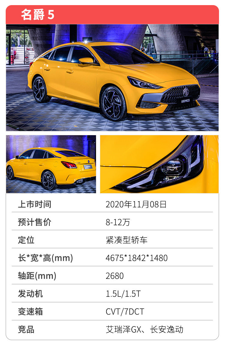 新车为运动型紧凑型轿车,定位比名爵6稍低,但车身尺寸与其并没有拉开太大差距,达到了4675*1842*1480mm,轴距则是2680mm,作为一款紧凑型轿车并没有落于下风。外观则应用了最新的家族式设计,颇有一种跑车的感觉,动力则提供了1.5L以及1.5T发动机,分别匹配CVT以及7速双离合变速箱,悬架为前麦弗逊后扭力梁式。配置方面,则有全液晶仪表盘、10.25英寸中控屏,电子挡把、全时安全辅助等配置。整体而言,它有着适合年轻人的多项优点,价格不高,高配置,好看,性能还不错。