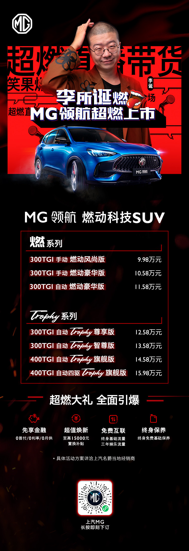 外在无处不燃,内有真功夫。10月27日“燃动科技SUV”MG领航上市,共推出7款车型,售价9.98万-15.98万元,不仅价格亲民,更带来福利满满的优惠政策:终身免费基础保养、至高15000元置换补贴、终身免费基础流量和三年娱乐流量、0首付/0利率/0月供金融礼。MG领航凭“五燃”真功夫引领二代SUV发展,价格和政策又如此诚意亲民,一经推出就迅速点燃车市热情,引发各界强烈关注!