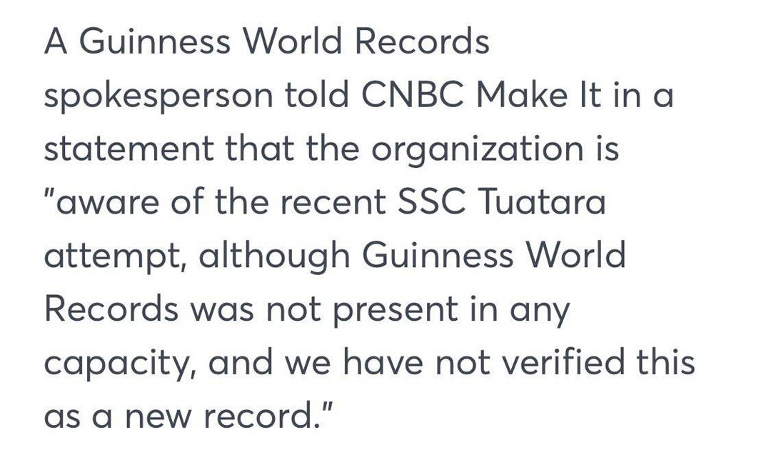 随后,SSC宣称这是吉尼斯认证记录,但吉尼斯官方表示:知道这次尝试,但没有吉尼斯官方人员以任何形式在场,记录未被认证。