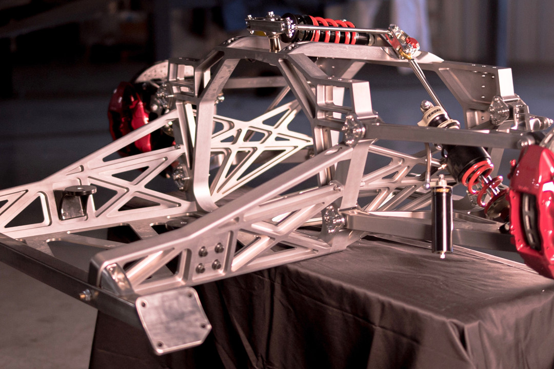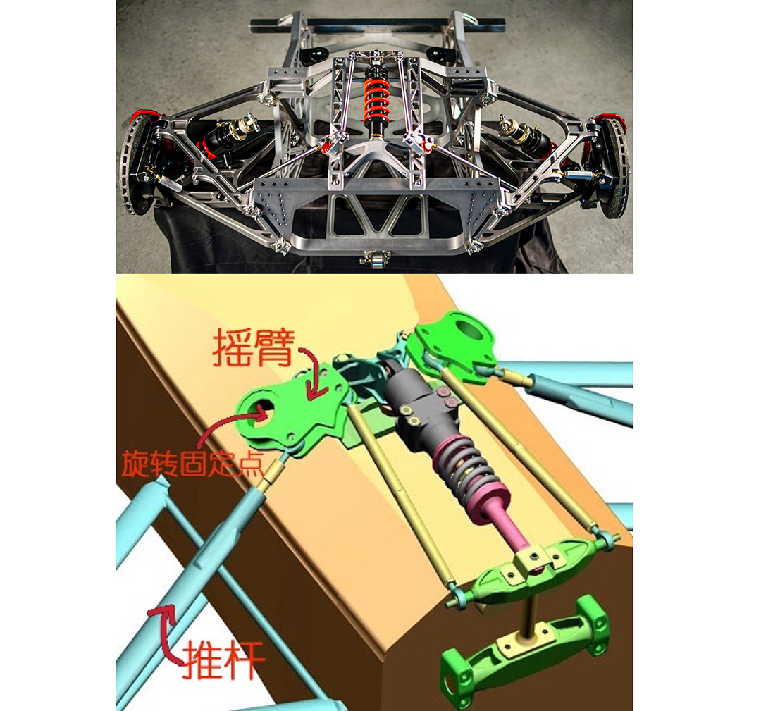 悬挂。我们传统理解的汽车悬挂每侧车轮分别有一根减震器,而SSC Tuatara还设置了第三根减震器。两侧的减震器就不用多说了,很明显的双叉臂悬挂结构,直接和碳纤维单体壳相连。第三根减震器推杆下部连接在下叉臂的中间,在车辆加速或者刹车时,车身会出现前后俯仰,以加速为例,车尾下沉,两遍轮胎相对车身向上运动,两遍推杆同时受理推动两个摇臂转动,摇臂带动横杆同时压缩弹簧,弹簧受力抑制车尾下沉。但…………对于直线加速,好像没什么用。