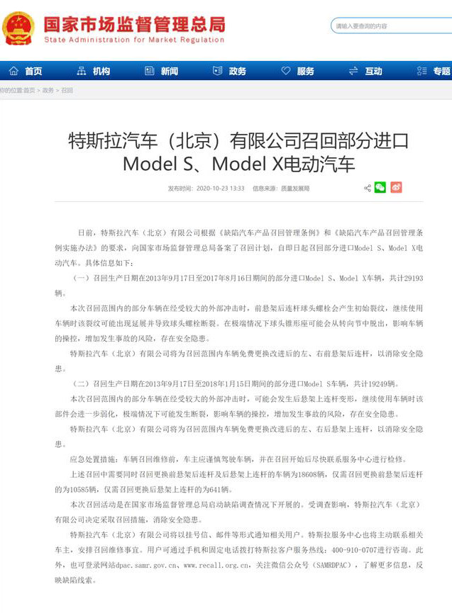 此次召回总计约5万辆车型,这基本上涵盖了特斯拉进入中国以来80%左右的Model S和Model X车型,这也是特斯拉在中国市场最大规模的召回。