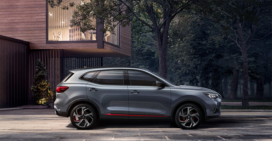 外观方面,MG领航采用的是第三代家族设计语言,同时也是名爵首款采用这一设计的SUV车型,中网造型极为浮夸,姿态凶猛,但也提高了车型的辨识度。MG领航的车身尺寸长宽高分别为4610*1876*1685mm,轴距达到2720mm,车侧设计较为饱满,而红色的刹车卡钳则带来一丝运动气息。