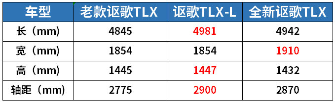 全新TLX的长宽高分别为4942*1910*1432mm,轴距为2870mm,其车身尺寸远大于同级的宝马3系标轴版,后者的长宽到分别为4719*1827*1459mm,轴距为2851mm。甚至与宝马5系标轴版接近,其长宽高分别为4976*1868*1498mm,轴距为2975mm。