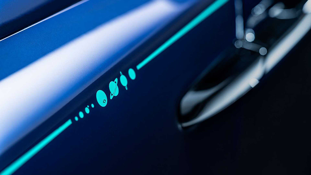 在外观上,新车采用宝石蓝车漆,寓意着地球表面的蓝色大海,而最特别的是在发动机田罩上喷绘的宇宙图案,内容则是从宇宙中鸟瞰中东的地图形状。