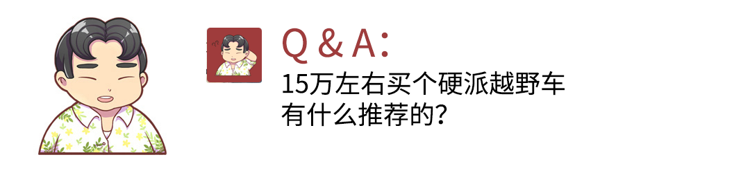 15万预算买个硬派越野车基本不现实,何为硬派越野车?硬派越野车的特点主要有非承载式车身、机械式分动箱带有差速锁的四驱、较大接近角和离去角等等。像吉普牧马人、奔驰大G和兰德酷路泽等车才能称为硬派越野车,这些可以在泥地、斜坡上纵横撒欢,这些车最便宜起售价都要40多万。
