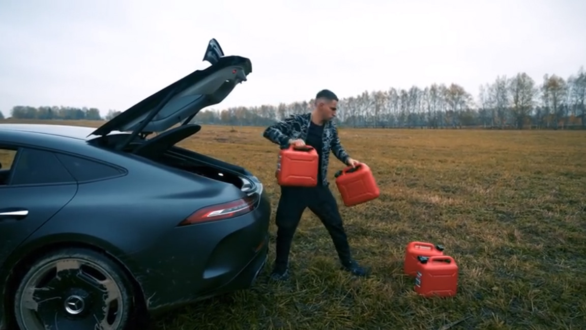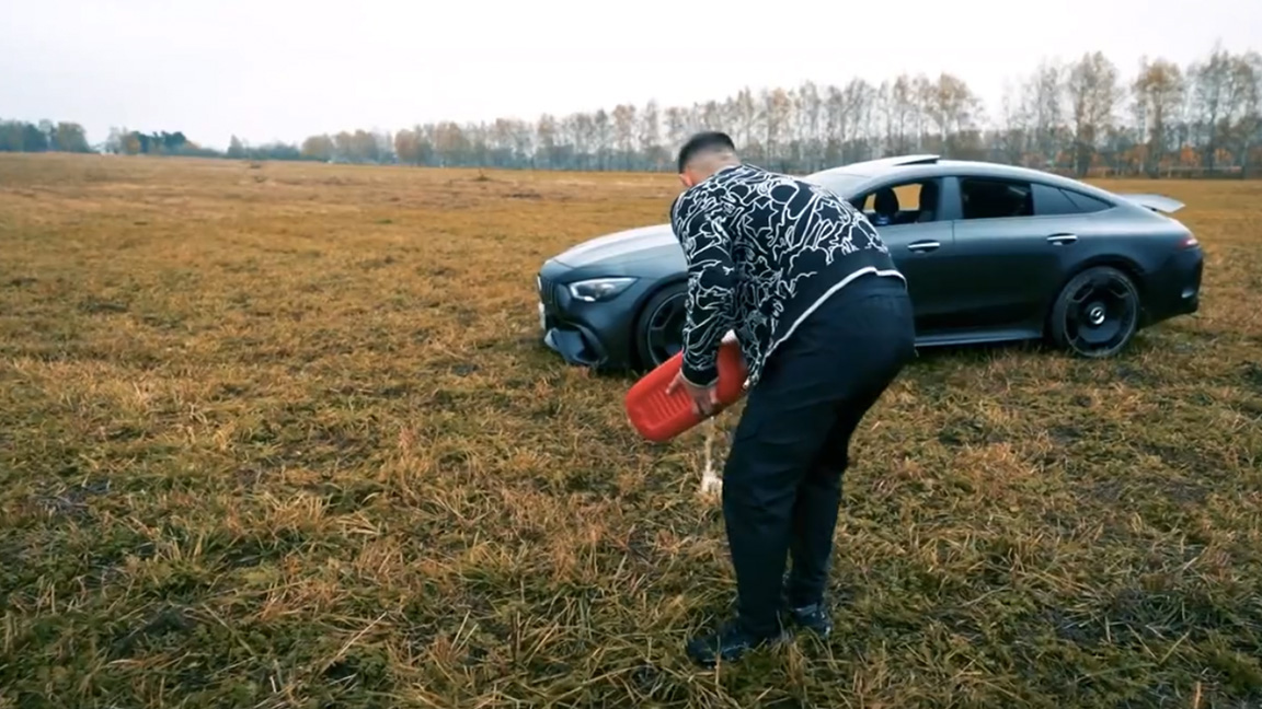 在视频开头,他把自己的AMG GT 63 S开到了大平原上,然后从后备箱中掏出了几罐油桶,接着把汽油全部洒在车的内外。