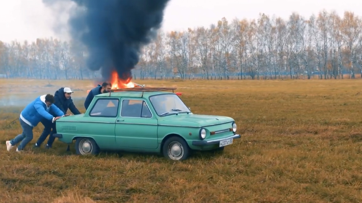 而整个视频的结尾也是别具心裁,车主坐上了一台老式苏联ZAZ轿车,起初也是着车失败,后来在朋友们的人工助力下成功启动车辆,慢悠悠的离去。不知道这个结果的意图是想表达已经没钱买车了,还是另一番讽刺呢?