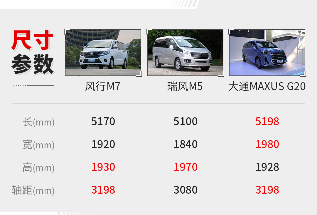 车身尺寸部分,风行M7长宽高分别5170/1920/1930mm,轴距3198mm,在同级型中轴距和车长有一定优势,而不错账面数据带来的宽大车身为其营造拔尖空间打下坚实的基础。