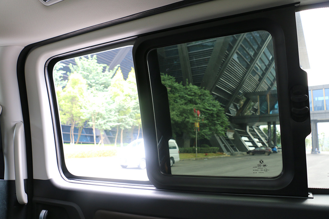 其次,风行M7采用双侧滑门设计,在第二排车窗开了一个可开式小窗,并且为保护乘员隐私,在后排车窗还装了隐私玻璃,很贴心。要是能配上第二排电动车窗和电滑门就更好了。