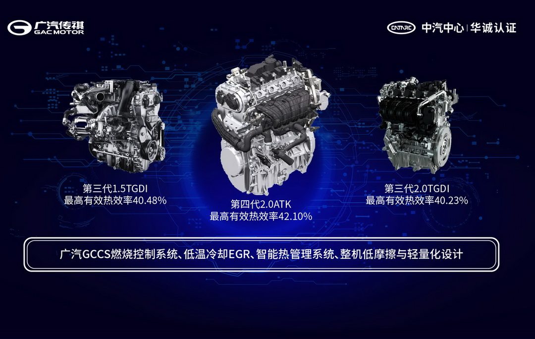 在今年9月21日,广汽传祺的第四代2.0ATK发动机经第三方认证机构——中汽研华诚认证检测实验,评定热效率42.1%,达到了全国第一,比丰田2.5L混动系统的发动机41%的热效率更高。而这款发动机采用阿特金森循环,压缩比高达15.6:1,最大功率只有105kW,最大扭矩180牛·米,约等于1.8L自然吸气的动力水平。种种迹象表明,这款发动机是为混合动力而生。