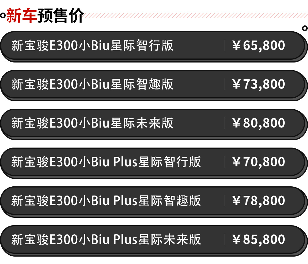 而就在11月2日,新宝骏品牌与苏宁联手打造的新宝骏E300小Biu正式发布预售,其预售区间为6.58-8.58万元,其中包含了E300小Biu(三座)和E300小Biu Plus(四座)。新车正是属于“跨界”定制款车型,同时也能看出这是新宝骏尝试新零售方式的第一步,也意味着这款定制款车型能通过网购方式购买。