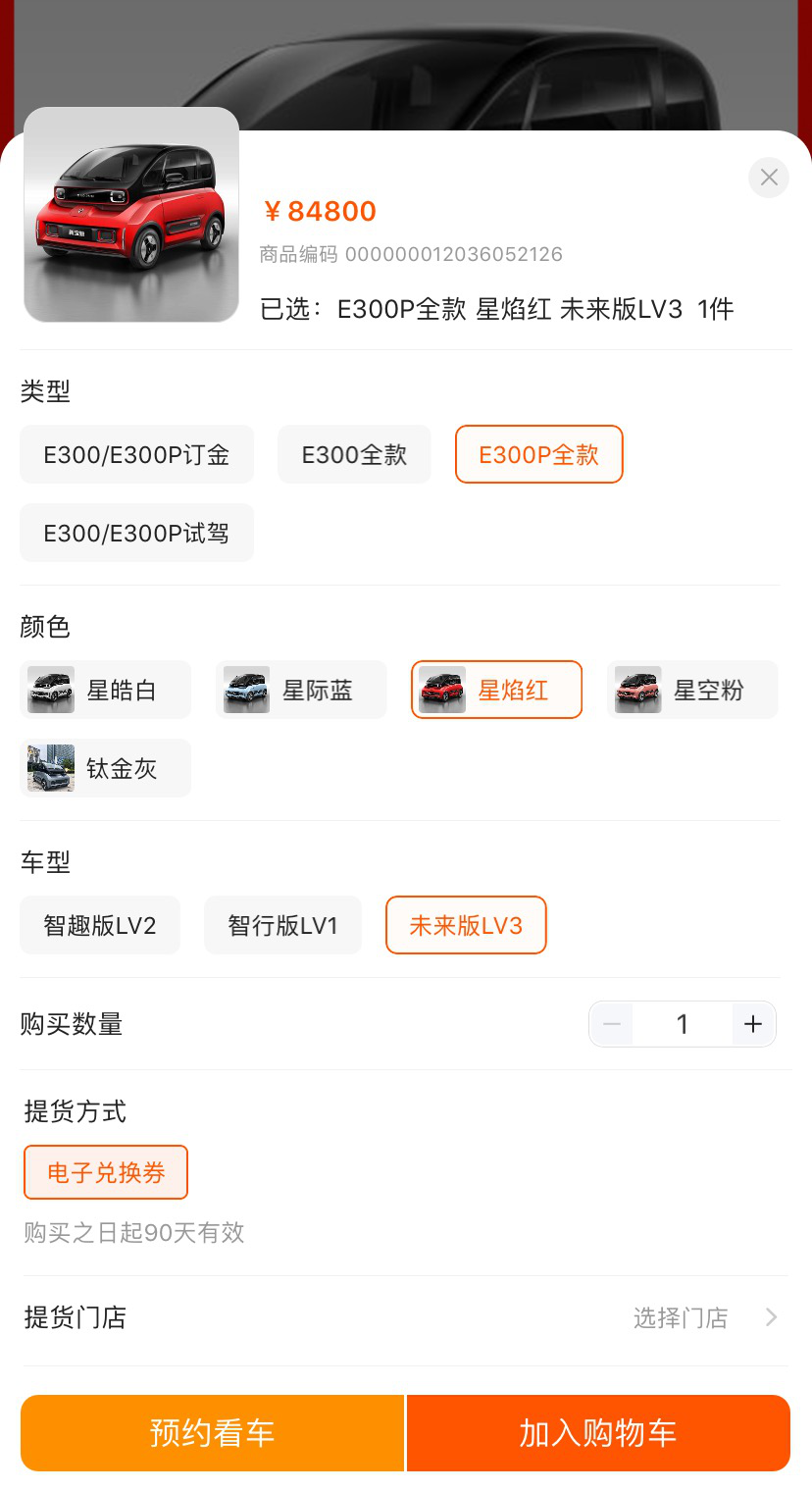 此时教授再尝试按了按加入购物车,能看到界面直接提供了试驾、定金以及全款三种选项,其中选择全款后便能继续挑选颜色和车型配置版本,也是非常简单的日常网购操作。不得不说当今新能源车的零售方式真是突飞猛进,要是哪一天被“种草”了也能足不出户完成“拔草”!想必受众人群多以年轻人为主。
