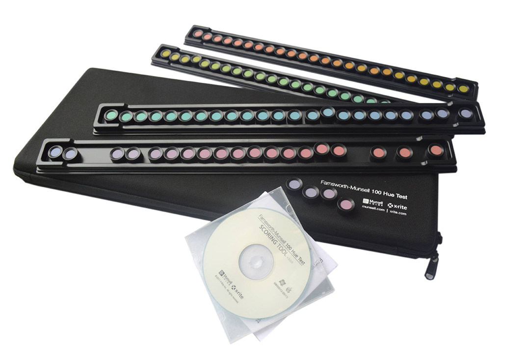 FM100孟赛尔色觉测试主要是通过4个黑色塑料盒子,93个色相棋子,其中85个可移动的色相棋子,按照颜色色相变化分装在4个塑料盒中,每个盒子两端各有一个固定的色相棋子作为色序参考。85个可移动棋子的背面有都有一个单一的顺序色相号,人员需要对每一个色相进行排列,随后FM100有一套评分系统,通过该系统可以对人员进行计分,出具测试报告。