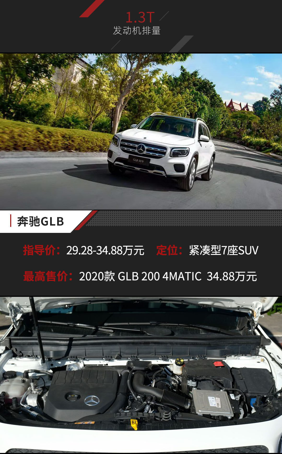 奔驰GLB,作为一款豪华品牌7座SUV,搭载的仅仅是一台1.3T的涡轮增压发动机,也就是奔驰A级身上的那台。低功率最大马力136Ps,高功率也不过是163Ps,看上去像是小马拉大车的感觉,实际上最高售价接近35万元了。