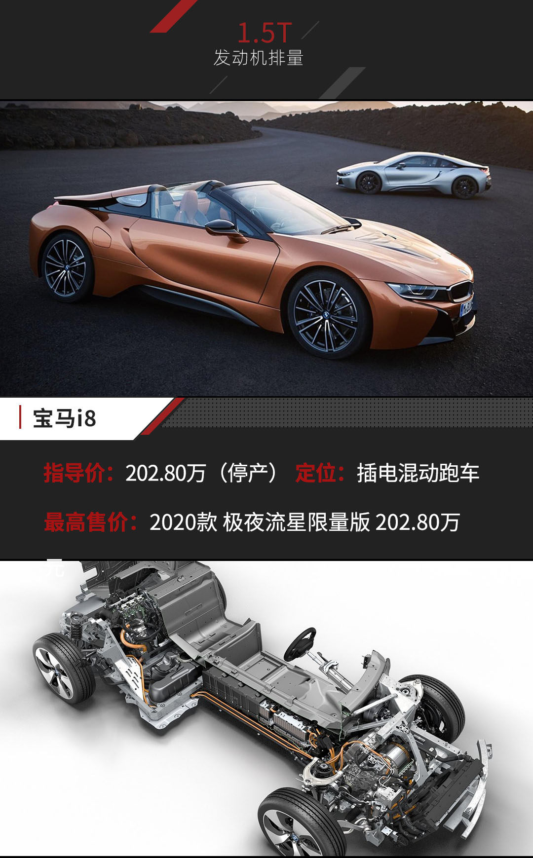 当然,在这台1.5T发动机之下,宝马i8其实还有电动机组成的插电式混合动力系统,最大功率为374Ps,最高车速达到250km/h,百公里加速时间3.8秒。看这参数的确有跑车的样子,但是大部分的土豪对这款车却提不起兴趣,直接导致了宝马i8在生产了7年,仅仅2万辆之后惨遭停产。