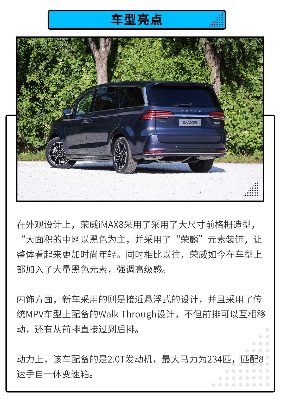 该车整体的设计均以年轻运动为主,这一点与同级的不少车型都有所不同,同时在车内配备Walk Through的设计在现在的车型中已经并不多见,这一点iMAX8还是做得不错的。