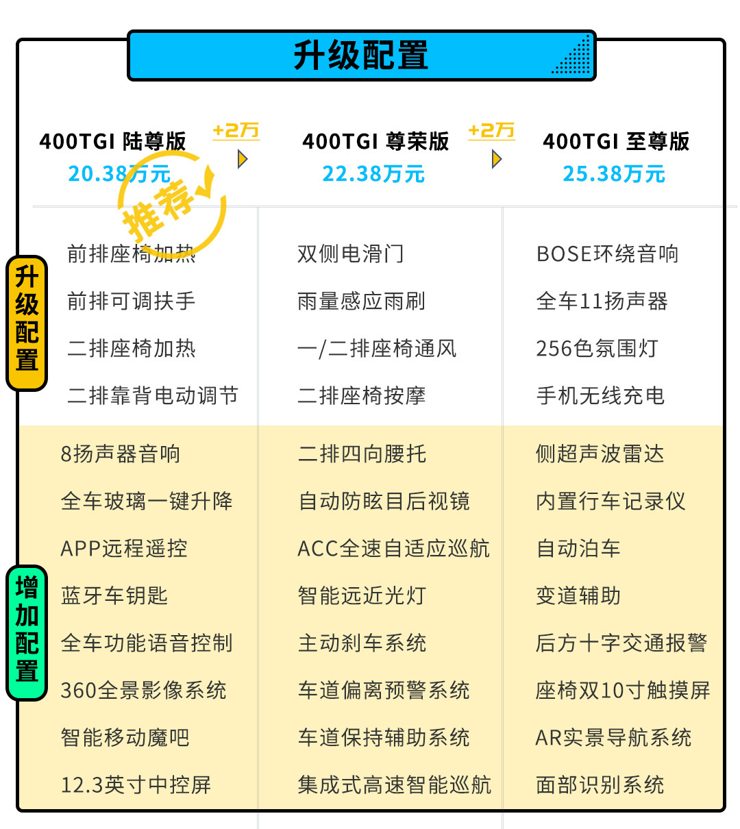 而再多2万元,则可以升级到次顶配车型,相比于前者,该车更多的是在驾驶辅助这样的科技配置上有所提升,同时双侧电滑门对于商用也更加体面,如果用商用需求或者经常需要长途驾驶,这个配置还是可以考虑的。