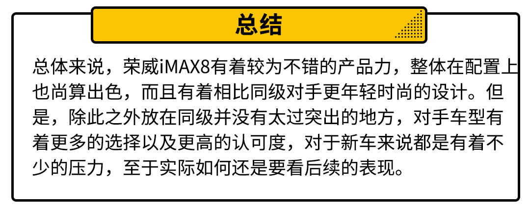 相比起已经在市场上混迹了一段时间的对手来说,iMAX8作为全新车型确实有着不错的产品力去竞争,但是还有部分需要学习的地方,尤其是在“家商”不是到位的情况下,商用有认可度极高的GL8,家用有性价比较为突出的传祺M8,新车如何去抗衡更多要看后续在市场上的表现了。
