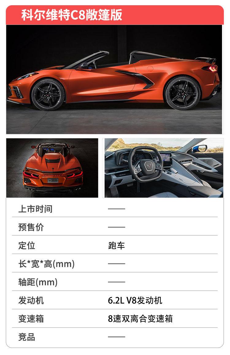 最后要提的是科尔维特C8,去年进博会品牌就带来了硬顶版本,而今年则继续展示敞篷版。很明显,C8代表着第八代科尔维特跑车,而新车之所以备受关注,除了拥有“美国国宝级跑车”的身份,更是因为其发动机布局从前中置改为了后中置,曾经的“美式肌肉车”摇身一变成为“超级跑车”。至于动力方面,新车搭载了6.2L V8自然吸气发动机,最大功率达502马力,在选装Z51运动套件后其0-100km/h的加速成绩甚至能低于3秒!