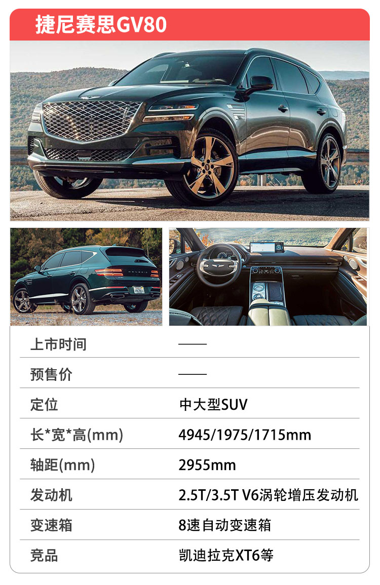 捷尼赛思GV80暂时是品牌的旗舰SUV,新车主打豪华中大型SUV市场,其在海外为消费者提供了2排/3排的座椅布局选择。而在设计上新车继续采用品牌全新设计语言,前脸拥有盾形格栅,前后均配备分体式灯组,独特的风格将在国内豪华品牌阵容中更具新鲜感。