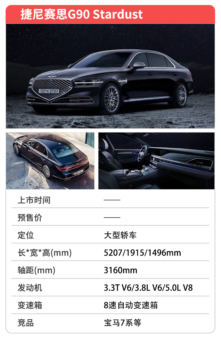 第三款车型是G90特别限量版Stardust,新车是基于捷尼赛思大型轿车G90升级而来,其与普通版的区别在于外观和内饰的细节升级,另外该车型已于7月在韩国限量50台发售。至于动力,G90限量版更是搭载了排量更大的3.3T V6、3.8L V6以及5.0L V8发动机,其中3.3T版本已能输出375马力,真真实实的大排量豪华车。