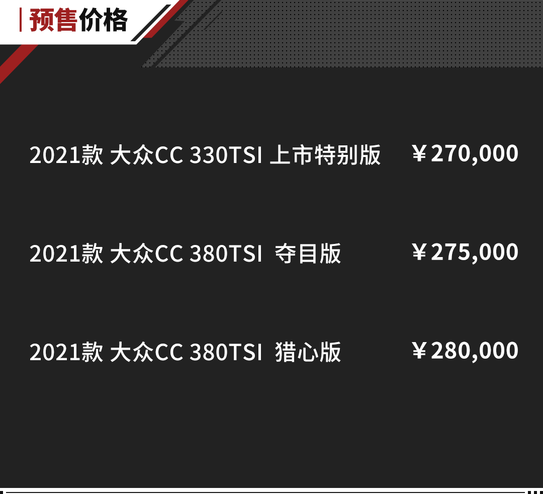 新款大众CC在10月31日通过线上直播的形式宣布正式开启预售,该新车一共推出三款车型配置,预售价格在27万至28万之间。
