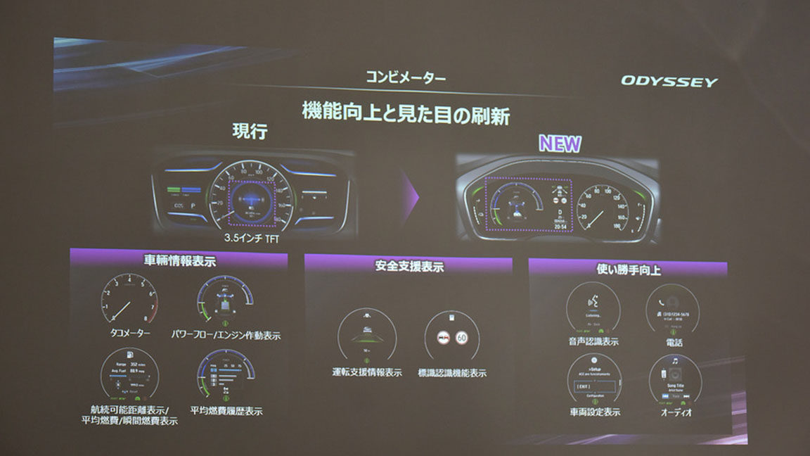 其中时速表被放在了右侧,油量条也从横置改为竖置;左侧是动力信息,包括辅助安全系统等。新设计有助于仪表功能的散布,而不是像之前那样大量信息显示集中在中间,据悉此改变是由于车主回馈的不足而来的。