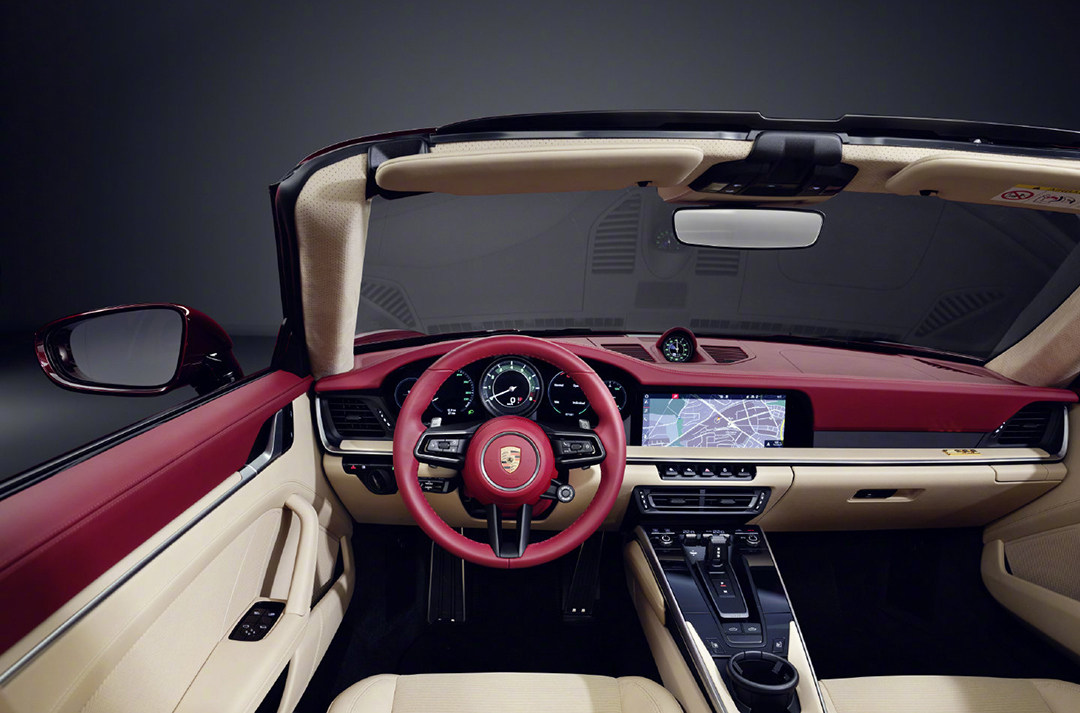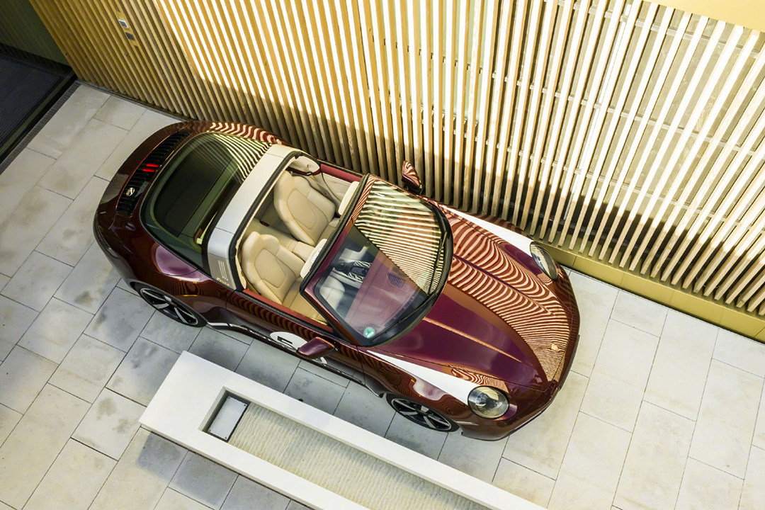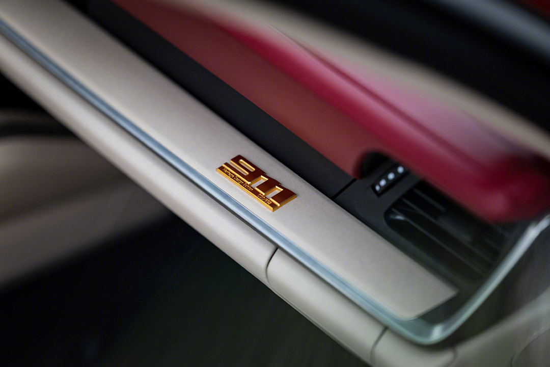 在外观上,最抢眼的设计元素是前翼子板上的箭头形赛车元素,而这两块白色贴花,代表了早期的赛车运动,此外独特的樱桃色车漆十分少见。而从1950年代中期开始,保时捷车尾的标志开始采用金色,这一点也在新车的车尾以及防滚架等细节上得到保留。新车提供两款独特的双色调真皮内饰:波尔多红色真皮搭配阿塔卡米色致新真皮,以及黑色真皮搭配阿塔卡米色致新真皮。