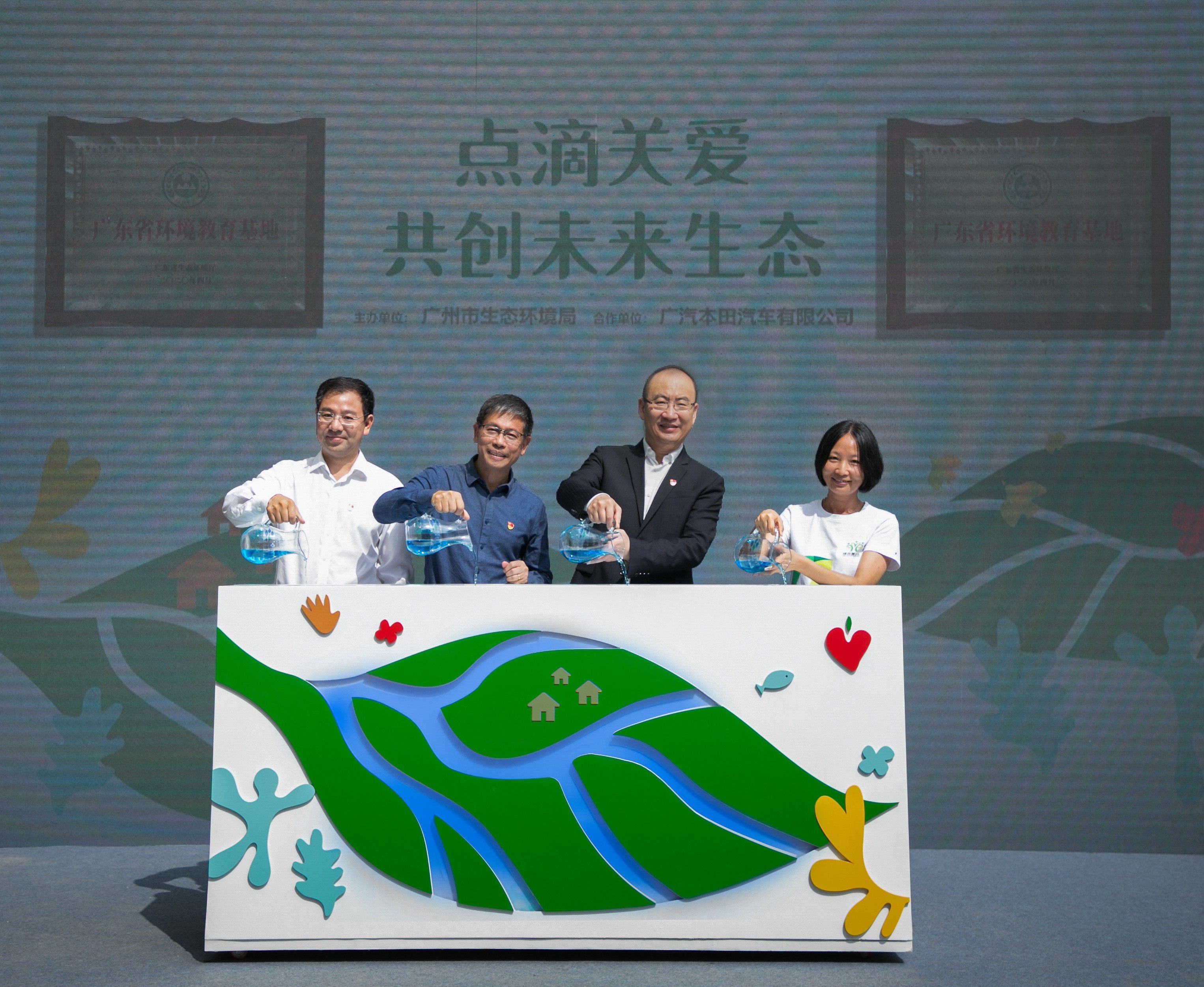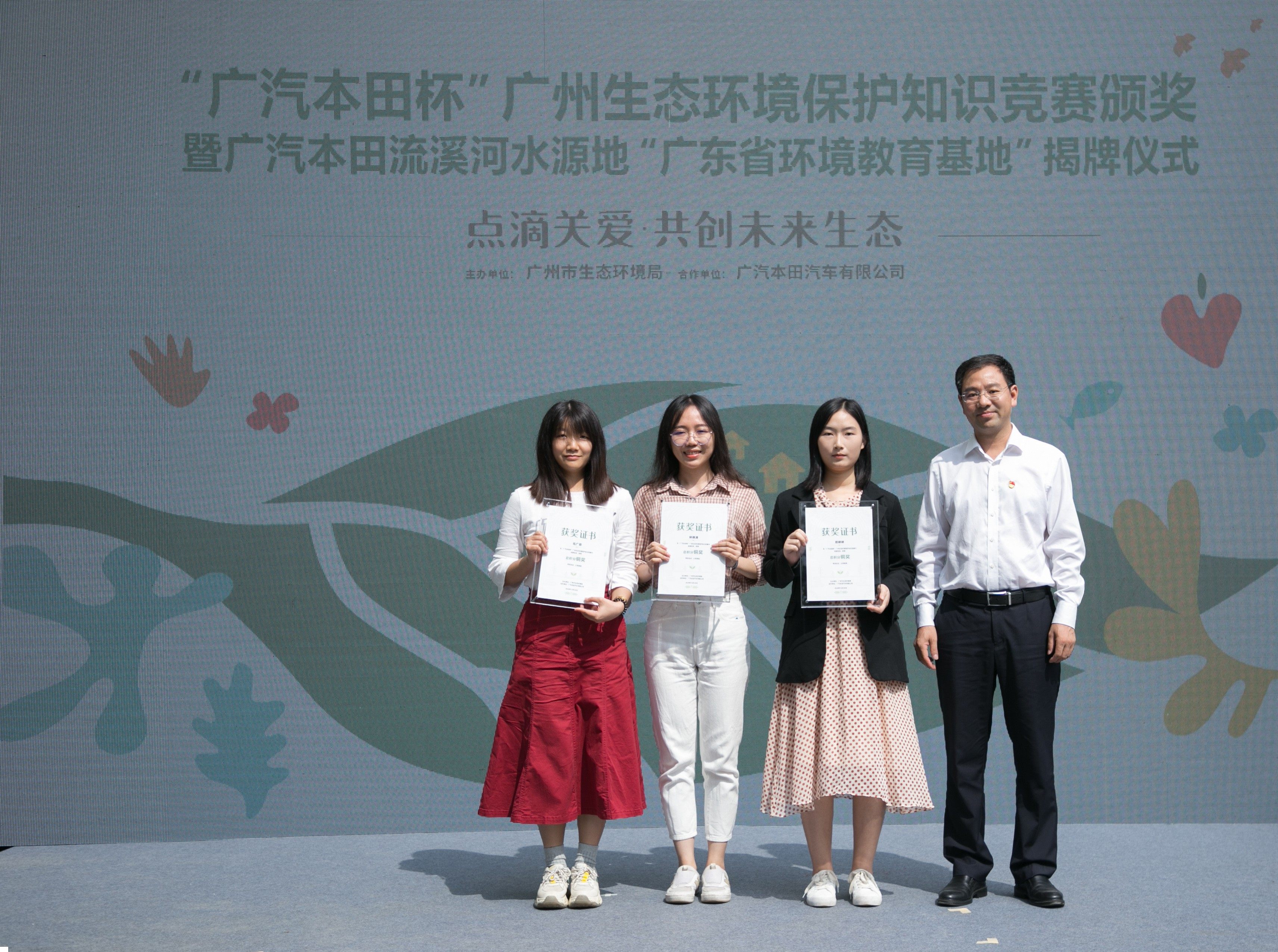 活动当天广州市生态环境局局长杨柳、广汽本田汽车有限公司执行副总经理郑衡、广东省环境保护宣传教育中心主任黄金平、广州市生态环境局局领导周洪平,分别为大赛的前10名获奖者颁奖,广州市生态环境局局长杨柳、广汽本田汽车有限公司执行副总经理郑衡、广东省环境保护宣传教育中心主任黄金平和广东省绿芽乡村妇女发展基金会秘书长邹伟全为广汽本田流溪河水源地“广东省环境教育基地”正式揭牌。