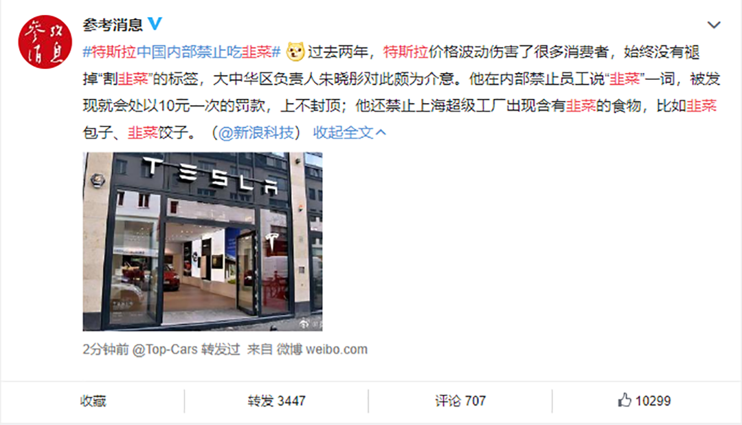 关于特斯拉与罚款的事,并不只限于其被罚,特斯拉在今年还发生过另外一件匪夷所思的新闻。在今年9月份,网络上盛传“特斯拉禁止员工说韭菜一词”或者“特斯拉内部禁止吃韭菜”的传闻。
