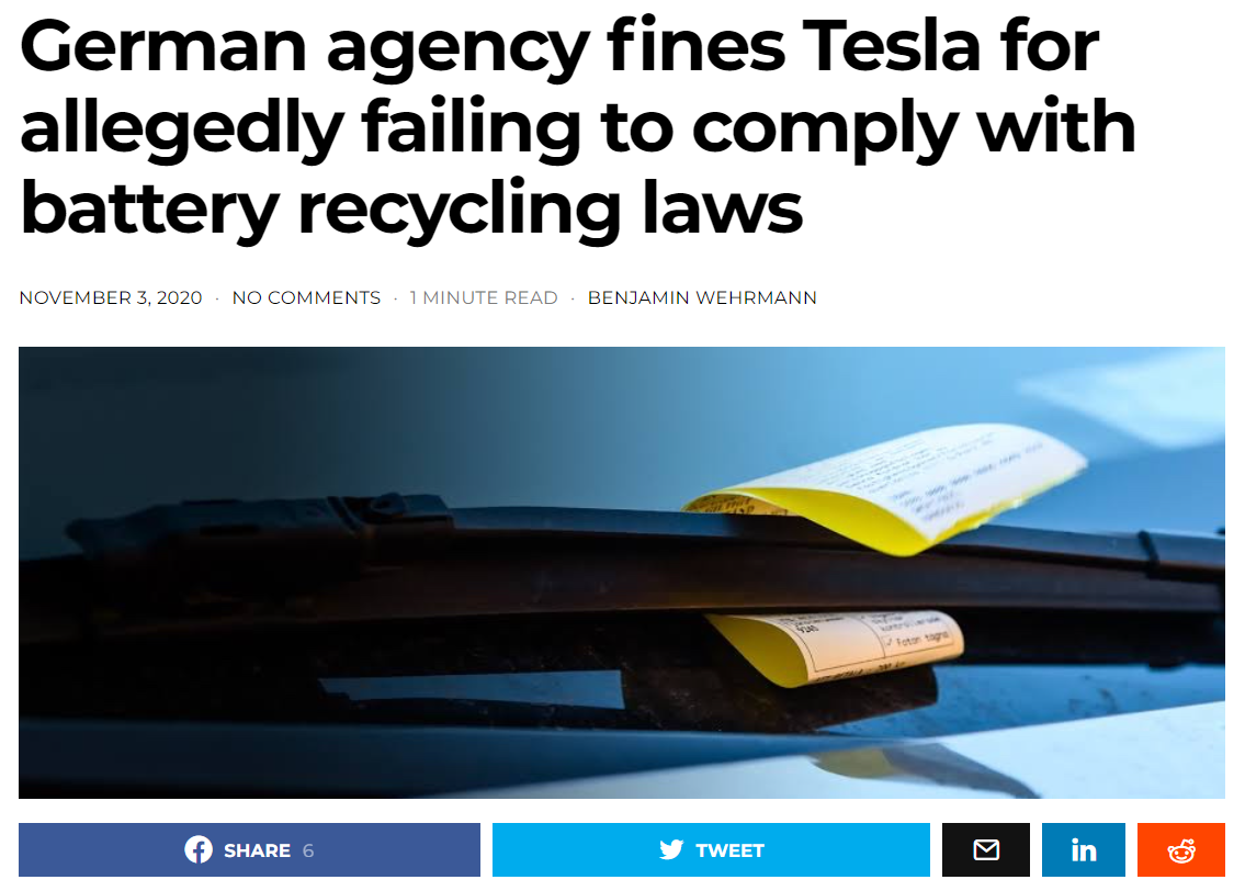 在10月底,特斯拉在向美国证券交易委员会(SEC)提交的一份文件中公布了德国联邦环境局开出的这笔罚款。文件中指出,“德国联邦环保局(简称UBA)向我们在德国的子公司发出了1200万欧元(1400万美元)的罚款通知,称我们未能遵守市场相关法律,并且未能根据该法律规定尽到报废电池产品的回收义务。”