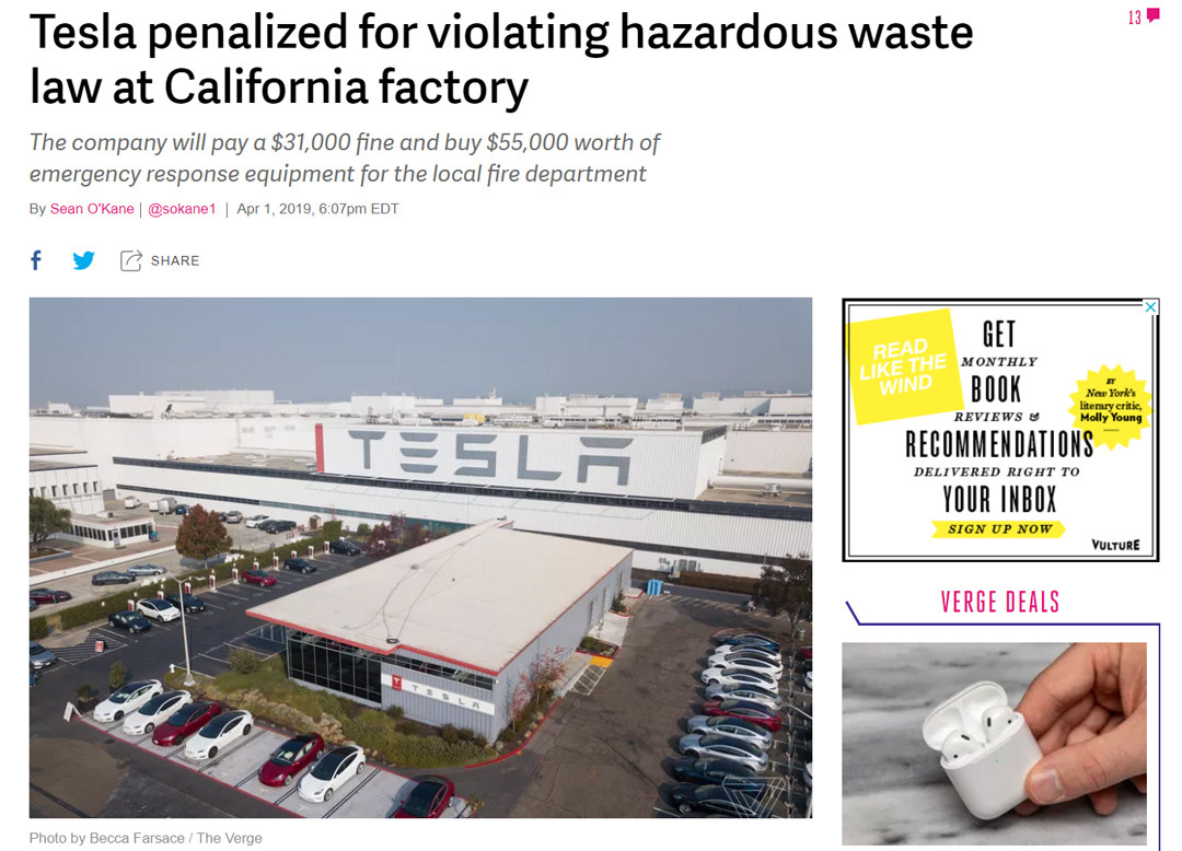2019年,美国环境保护署在一份声明中表示,在2017年特斯拉位于加州弗里蒙特的工厂遭到突击检查后,特斯拉将采取具体措施来妥善管理其工厂的危险废弃物。美国环境保护署称此前特斯拉工厂设备排放未能达到空气排放标准以及危险废物的管理要求。