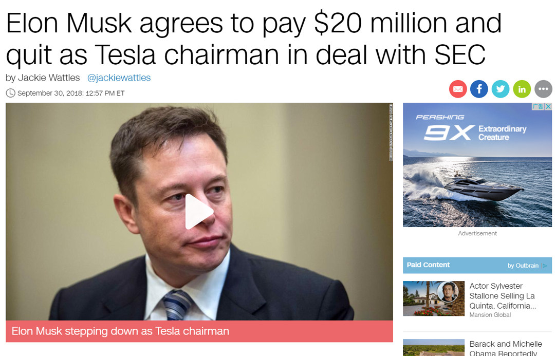 最终根据和解协议规定,由于特斯拉汽车公司掌门人埃隆·马斯克涉嫌“股票市场欺诈”达成和解,当事人同意辞任董事会主席,保留首席执行官职务,他个人和特斯拉企业分别支付2000万美元罚款。